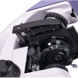 Il existe une commande de mise au point rapide et une commande de mise au point fine, le mouvement du bouton de mise au point est souple et ne nécessite aucun effort supplémentaire. La commande de mise au point rapide dispose d'un bouton de blocage et d'un réglage de la tension. Les boutons de mise au point sont coaxiaux et positionnés pour un confort maximal lors d'observations de plusieurs heures. Ils sont situés sur la base de la tête du microscope, ce qui vous permet de poser confortablement vos mains sur la table.