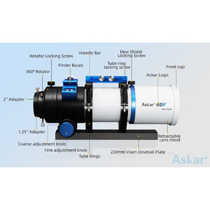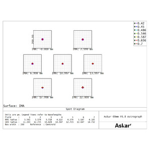 L'Askar Flatfield-Apo dispose d'une conception à trois lentilles à l'avant de l'objectif et d'une lentille de correction à l'arrière. Un verre ED dans l'objectif réduit efficacement les aberrations chromatiques. L'Apo est corrigé pour les appareils photo plein format 44 mm.