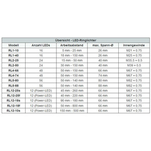 Die Serien RL4 und RL5 sind vorrangig als Auflicht-Beleuchtung für die Mikroskopie konzipiert. Der Arbeitsbereich der Ringlichter ist so gewählt, dass der Fokus im typischen Abstand von Objektiv und Objekttisch von Standard-Mikroskopen liegt. Beide Serien gibt es jeweils mit zwei Innendurchmessern, wodurch für alle gängigen Mikroskop-Typen das passende Modell zur Verfügung steht.