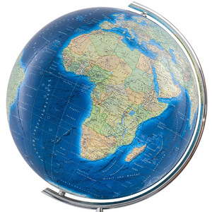 Unbeleuchtet sieht man das tiefe Blau der Ozeane. Wird das Kartenbild beleuchtet, sehen wir die gesamte Bodenstruktur, die Tiefen, die Vulkane und die Meeresbecken. Die Kontinente sind mit strahlend blauen Vignettierungen umrandet, die das gesamte Erscheinungsbild noch eleganter und attraktiver machen. Aber nicht nur im Meer bekommt man diese faszinierenden Effekte zu sehen, auch an Land bemerkt man die farblich harmonisch abgestimmten Länder und Grenzen der Welt, die bei Beleuchtung Berge und Täler zeigen.