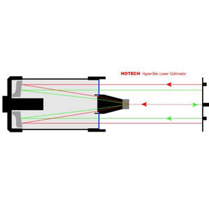 Mit dem cleveren HyperStar SC Laser Collimator justieren Sie Ihr Schmidt-Cassergarin Teleskop in kurzer Zeit mit einer extrem hohen Präzision. Sie brauchen dazu keinen klaren Himmel, Sie benötigen dazu keinen Stern. Diese Hotech Justiereinheit besteht aus einer Zielscheibe, in die drei verschiedene Laser eingelassen sind. Vor der Justage wird die Scheibe vor der Öffnung Ihres Teleskops aufgestellt. Die Laserstrahlen treffen dabei auf den Hauptspiegel, werden reflektiert und treffen wieder auf die Zielscheibe.