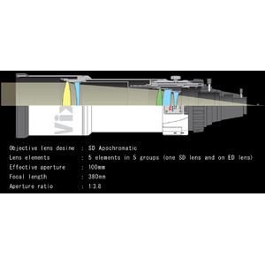 Mit fünf Linsenelementen in fünf Gruppen ist dieser Refraktor frei von Farbfehlern und optimiert für die Astrofotografie. Das ebene Bildfeld ermöglicht die Fotografie bis hin zur 645-Mittelformatkamera. Verwendet wird eine SD-Linse in der Frontobjektiv Gruppe und eine ED-Linse in der hinteren Gruppe, um eine hervorragende Farbkorrektur zu erreichen. Die blauen Halos um Sterne, die in der Astrofotografie wahrnehmbar sind, werden erfolgreich korrigiert. Zusätzlich werden Astigmatismus sowie Koma und Aberrationen auf ein extrem hohes Niveau korrigieren.