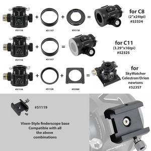 Alle drei Modelle werden mit den passenden Adaptern ausgeliefert (siehe Bild). Sie schließen Ihren Okularauszug damit ganz simpel an Ihr Teleskop an.