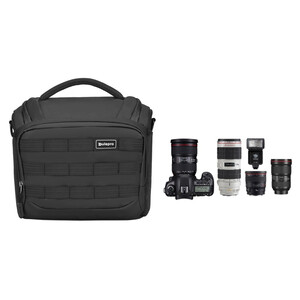 Diese große Schultertasche bietet Platz für eine Sytermkamera oder DSLR-Kamera mit mehren Objektiven und ein Blitzgerät oder einem zweiten Gehäuse. Tele-Objektive bis 70-200mm f:2.8