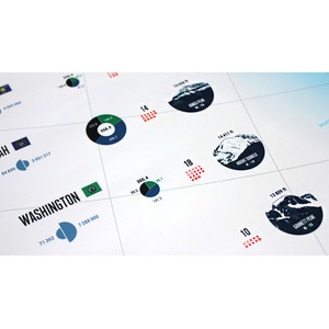 Infografiken für den kanadischen und den US-amerikanischen Teil der Karte, sowie für die 15 Staaten bzw. Provinzen oder Territorien ergänzen die Karte.